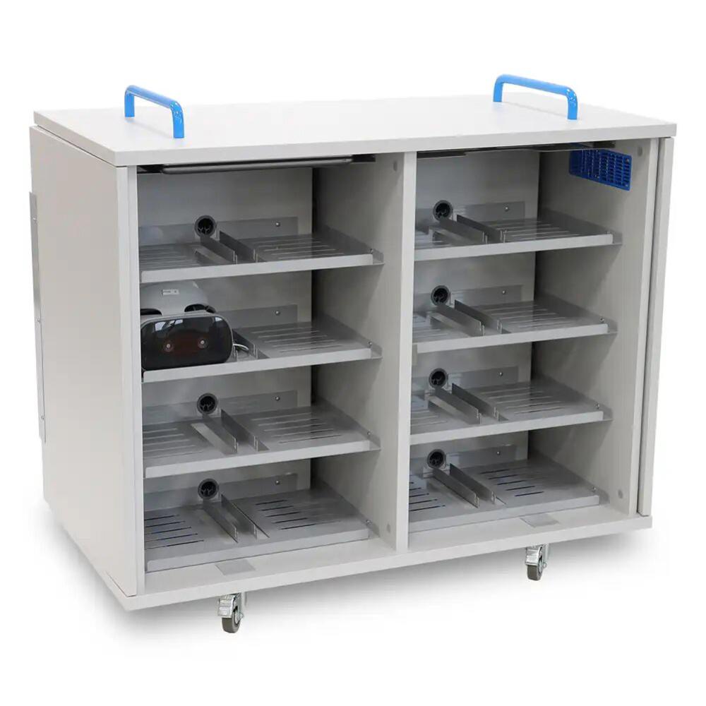 The Lyte 16 Double Door VR USB C Mobile charges 16 VR headsets. Equivalent to 32 x 10.5W USB C Charging Ports saving you space and power consumption, replacing extension cables and power sockets with one cable into the wall. It is fast and flexible with simultaneous charging and a programmable timer. With individual device compartments that store devices horizontally within a compact footprint. Two additional top shelves available to store laptops. The fast charging ensures devices are ready to go when you need them. Provides maximum security & safety with a dual point locking system and separate lockable power compartment.