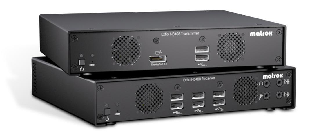 EX-DEMO. Matrox Extio N3408 IP KVM extenders deliver 4K/UHD performance or quad-monitor capabilities over standard Gigabit Ethernet at ultra-low bitrates. Easy to set up, Extio N3408 can be configured as a point-to-point or networked KVM extender to deliver multiple video, keyboard, mouse, USB 2.0, and audio signals using a single fiber optic or copper cable. Aggregated and seamless control of multiple systems from a remote display station with a single keyboard and mouse set leads to efficient operations and increased productivity. TAA compliant SKU available.
