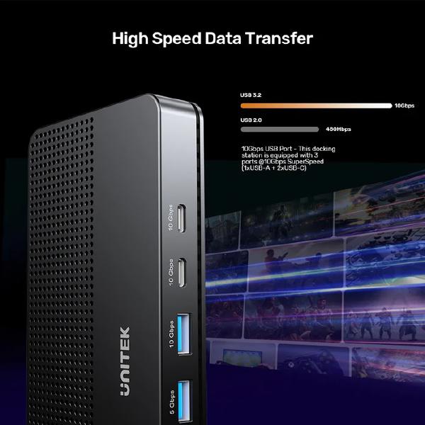 UNITEK USB-C Single 8K/ Triple 4K Docking Station allows you to connect to all the peripherals you need. With 100W Power Delivery and a maximum of three display output, this docking station turns your laptop(s) into a full workstation that can enhance productivity with a clean workspace.